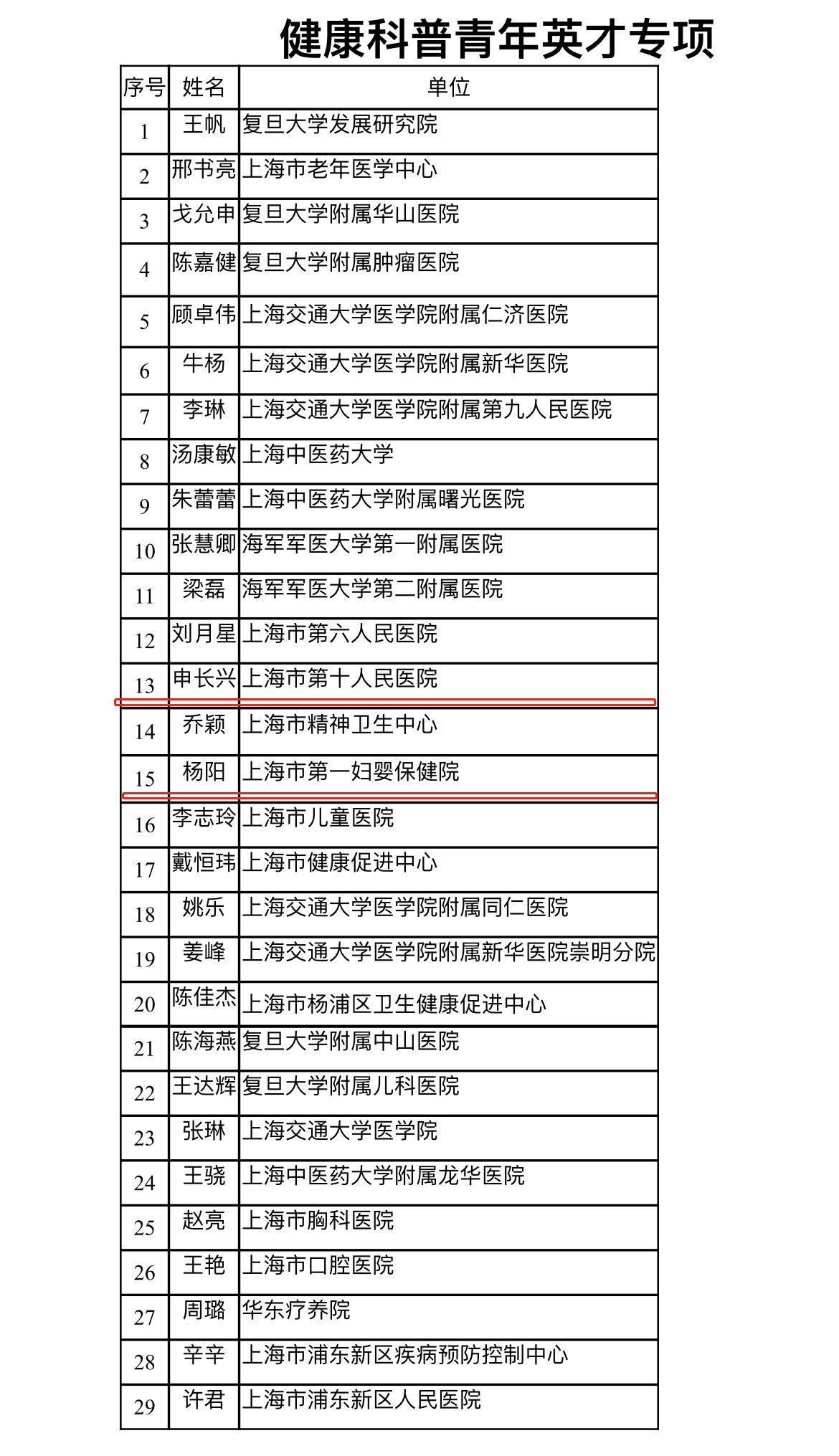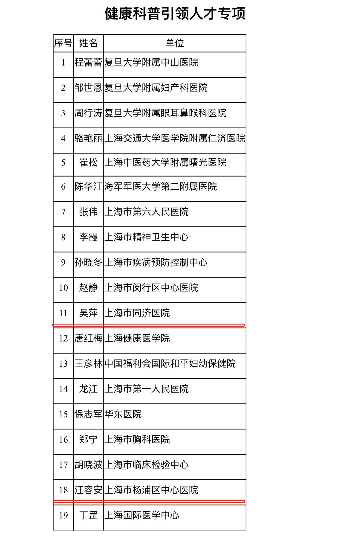 为大力培育健康科普高端人才与青年英才,上海市率先在全国推出有财政经费支持的健康科普人才能力提升专项。目前首轮上海市健康科普人才能力提升专项名单正式发布,pg游戏电子模拟器附属同济医院吴萍医生、pg游戏电子模拟器附属杨浦医院江容安医生获得健康科普引领人才专项;pg游戏电子模拟器附属第十人民医院申长兴医生、pg游戏电子模拟器附属第一妇婴保健院杨阳医生获得健康科普青年英才专项。