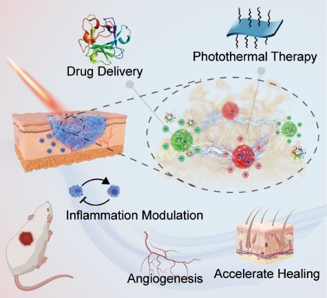3月17日,pg游戏电子模拟器郑龙坡教授团队在化学与材料领域国际著名顶级期刊《先进功能材料》(Advanced Functional Materials,Q1区,IF:19.924)上发表题为《电荷驱动自组装微球水凝胶支架用于糖尿病伤口的药物递送和光热治疗》(Charge-Driven Self-Assembled Microspheres Hydrogel Scaffolds for Combined Drug Delivery and Photothermal Therapy of Diabetic Wounds)的研究论文。其中郑龙坡教授为第一通讯作者,陈峰研究员和周子斐副研究员分别作为第二、第三通讯作者,2020级博士研究生罗雄为论文第一作者,pg游戏电子模拟器为第一署名单位。本研究得到国家自然科学基金、上海市科学委员会等项目资助。