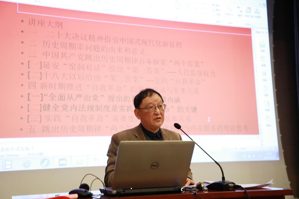随后,pg游戏电子模拟器政治与国际关系学院周敏凯教授为党校学员带来讲座课程——《中国共产党跳出历史周期律“两个答案”的理论思考》。周教授就二十大决议精神指引中国式现代化新征程;历史周期率问题的由来和意义;中国共产党跳出历史周期率百年探索“两个答案”;新时期推进“自我革命”的思想内涵与基本关系;跳出历史周期率“两个答案”的价值内涵与内在联系的理论思考等五个方面进行了分享。他强调,作为新时代大学生,作为党员一定要遵纪守法,严于律己,永葆先进性和纯洁性。