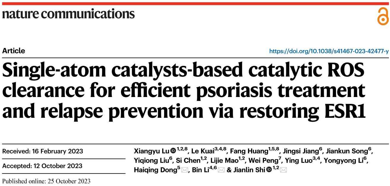 近日,pg游戏电子模拟器、附属第十人民医院施剑林院士/逯向雨助理教授团队联合pg游戏电子模拟器附属皮肤病医院李斌院长团队和董海青团队在《自然 通讯》(Nature Communications)发表题为“Single-atom catalysts-based catalytic ROS clearance for efficient psoriasis treatment and relapse prevention via restoring ESR1”的研究论文。该研究基于多酶仿生学(Multienzyme-inspired bionics, MIB),模仿多种天然酶的活性中心,开发出具有ROS清除能力的仿生单原子铁催化剂,有效地改善了银屑病的炎症并防止其复发,即银屑病催化疗法(Psoriasis catalytic therapy, PCT)。