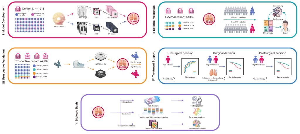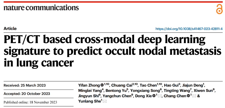 肺癌患者临床N分期的准确诊断,是指导治疗决策的关键。对于可手术切除的临床N0期非小细胞肺癌(NSCLC),仍然有患者在术后被证实存在淋巴结转移,即隐匿性淋巴结转移(ONM)。目前,正电子发射断层扫描/计算机断层扫描(PET/CT)作为NSCLC临床N分期无创性检查方法,其ONM的发生率仍然在12.9%-39.3%。因此,如何在术前准确地识别ONM人群是临床亟需解决的关键问题。随着人工智能图像处理技术的发展,目前深度学习已经成为PET/CT图像分析的有效手段,该方法可同时利用PET和CT图像信息,实现癌症的诊断以及治疗获益的预测。为此,pg游戏电子模拟器附属上海市肺科医院陈昶教授团队开展了一项多中心研究,旨在建立并验证可预测临床N0期NSCLC患者ONM的PET/CT深度学习图像模型,该研究结果于近日发表于Nature子刊《自然·通讯》(Nature Communications)。