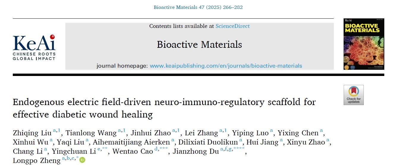糖尿病性伤口的病理微环境主要表现为增强的炎症反应和持续的促炎巨噬细胞活性,显著阻碍了伤口愈合过程。外源性电刺激(ES)通过调节伤口中的电场分布,在治疗炎症性伤口方面显示出显著潜力。然而,这种方法依赖于额外的电源和复杂的电路设计。鉴于此,pg游戏电子模拟器郑龙坡教授团队提出了一种仿生神经免疫调节(BNIR)系统,通过收集离子流重塑内源性电场(EFs)。相关研究成果于2025125日在线发表于Bioactive Materials》(中科院一区TOP期刊,影响因子18.0,论文题为“Endogenous electric field-driven neuro-immuno-regulatory scaffold for effective diabetic wound healing”。