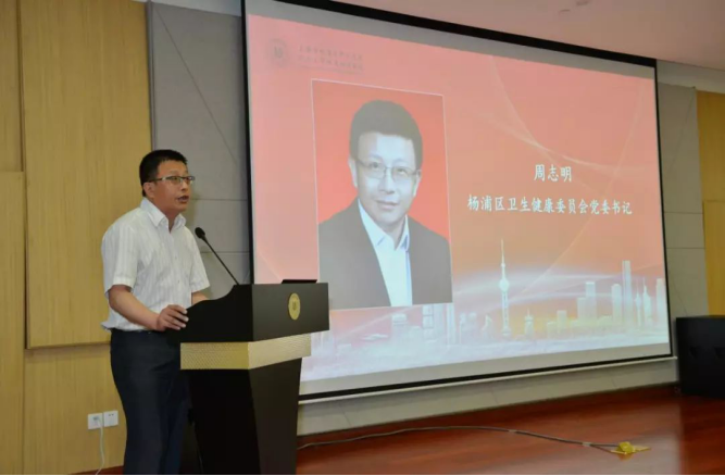 杨浦区卫生健康委员会党委书记周志明致辞,希望教学实训中心的建成启用,进一步加快完善全科医生的培养体系,为杨浦区域内,乃至整个上海市全科医师规范化培训、医学生和进修生临床后期实践搭建学习、交流的平台。