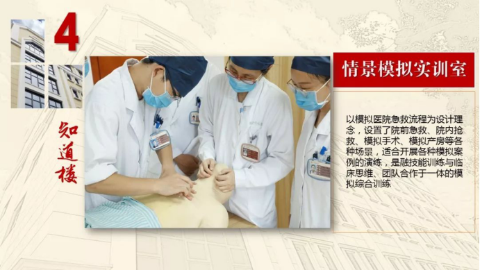 4楼是情景模拟实训室,模拟医院的急救流程,设置了院前急救、院内抢救、模拟手术、模拟产房等各种场景,适合开展各种模拟案例的演练,是融合技能训练与临床思维、团队合作为一体的模拟综合训练。