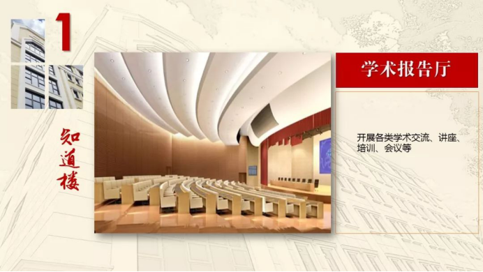 1楼是学术报告厅,可以同时容纳200人开展学术交流、讲座、培训、会议等。