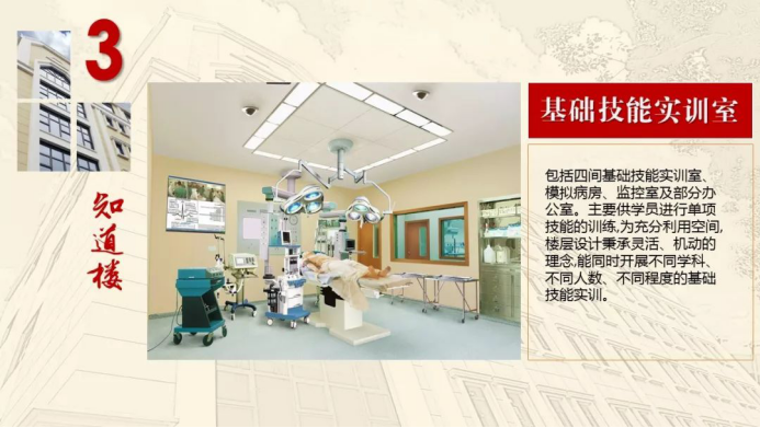 3楼是基础技能实训室,包括4间基础技能实训室、模拟病房、监控室及部分办公室。主要供学员进行单项技能的训练,能同时开展不同学科的基础技能实训。
