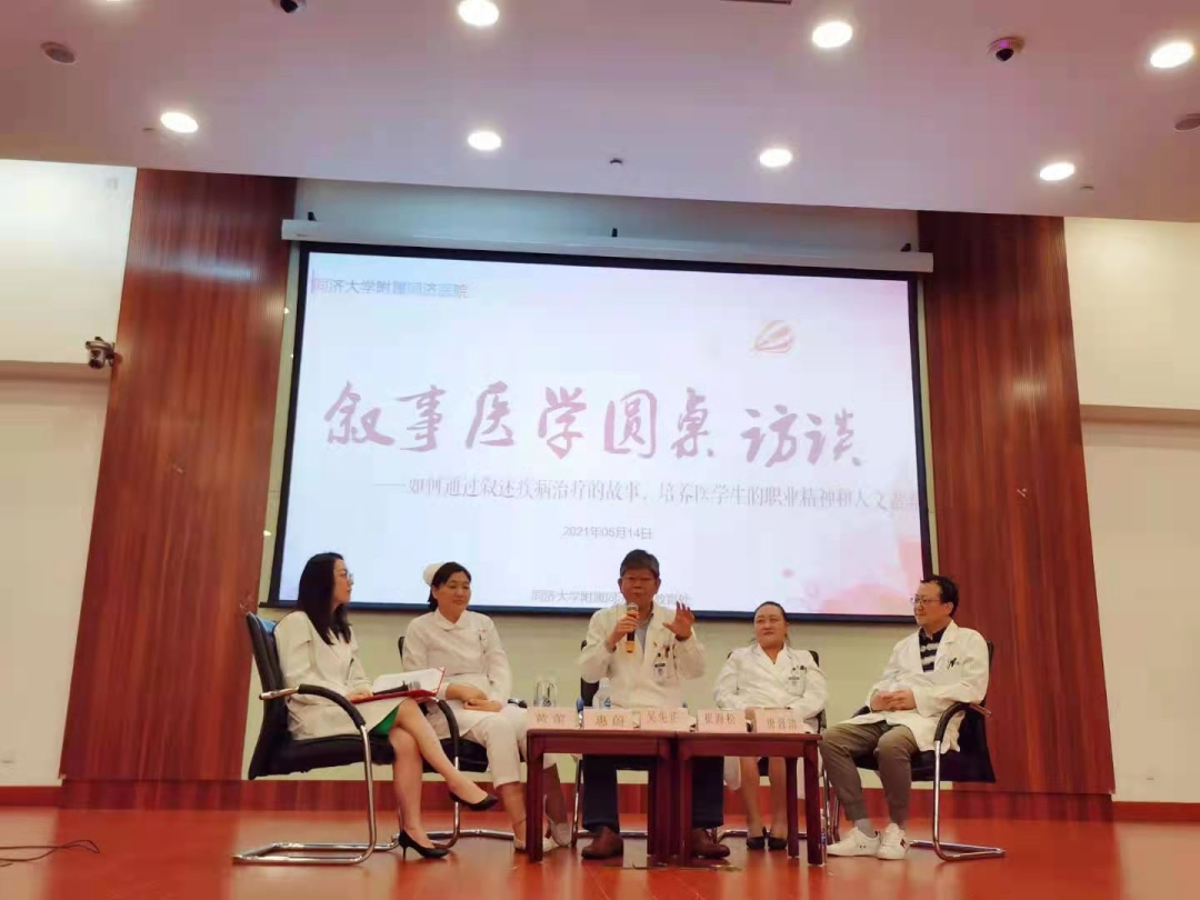 最后,邀请同济医院急诊医学科吴先正老师、精神医学科崔海松老师、儿科唐晋清老师和呼吸与危重症医学科惠蔚老师开展了一场“叙事医学圆桌访谈”。几位教师分享了从医生涯中印象深刻的医患故事,医患沟通中容易被忽视的内容,年轻医生在成长过程中面临的挑战与困难。随后师生共话,对患者眼中的好医生形象展开讨论。各位教师寄语医学生们在学医道路上不懈努力,在职业生涯中不忘初心,成为一名具有人文关怀精神的医生。