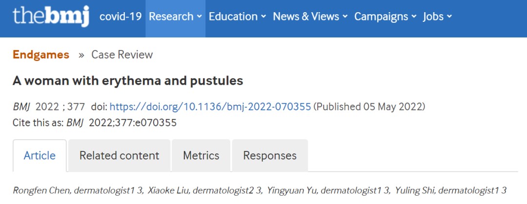 近日,pg游戏电子模拟器附属皮肤病医院史玉玲教授团队在国际著名综合性医学期刊《英国医学杂志》(The BMJ, IF: 39.89)上发表题为“A woman with erythema and pustules”的病例报告,本文的第一作者是陈荣芬医生。