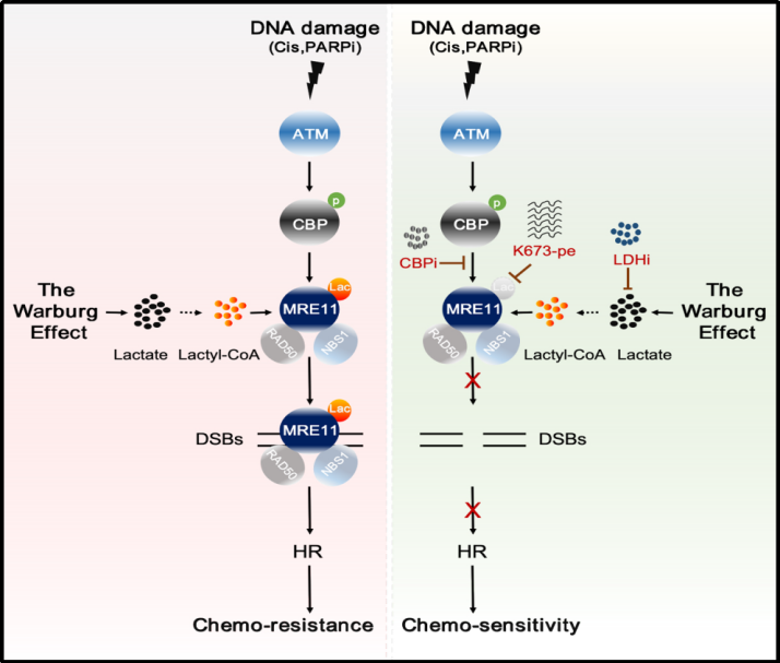 研究团队发现,乳酸通过诱导DNA损伤修复关键蛋白——减数分裂重组蛋白11(MRE11)发生乳酸化修饰,促进同源重组修复(HR),导致化疗耐药的分子机制和生物学作用。
