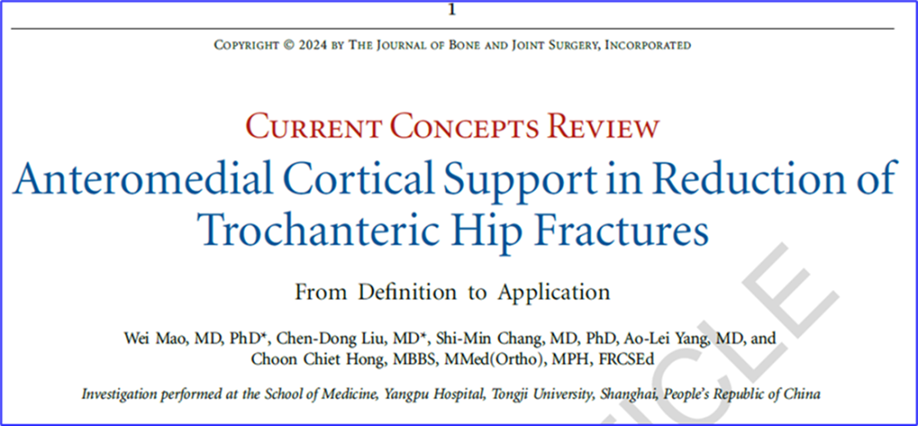 2024年4月29日,JBJS发表了pg游戏电子模拟器附属杨浦医院骨科张世民教授团队的特邀约稿综述论文,即Current Concepts Review (CCR),以介绍我校原创骨科手术理论:髋部转子间骨折“前内侧皮质支撑”理论与“张氏复位标准”。该综述论文标题为Anteromedial Cortical Support in Reduction of Trochanteric Hip Fractures: From Definition to Application(股骨转子间骨折的前内侧皮质支撑复位:从定义到应用)
