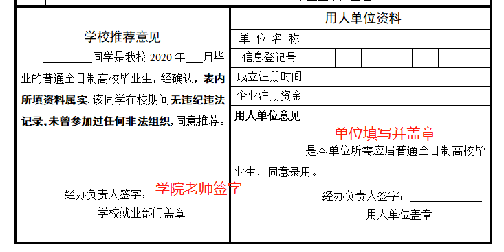 ② 填写《2021年非上海生源应届普通高校毕业生进沪就业登记表》,学校推荐意见栏由学院就业负责人签字,用人单位资料栏由单位填写并签章;