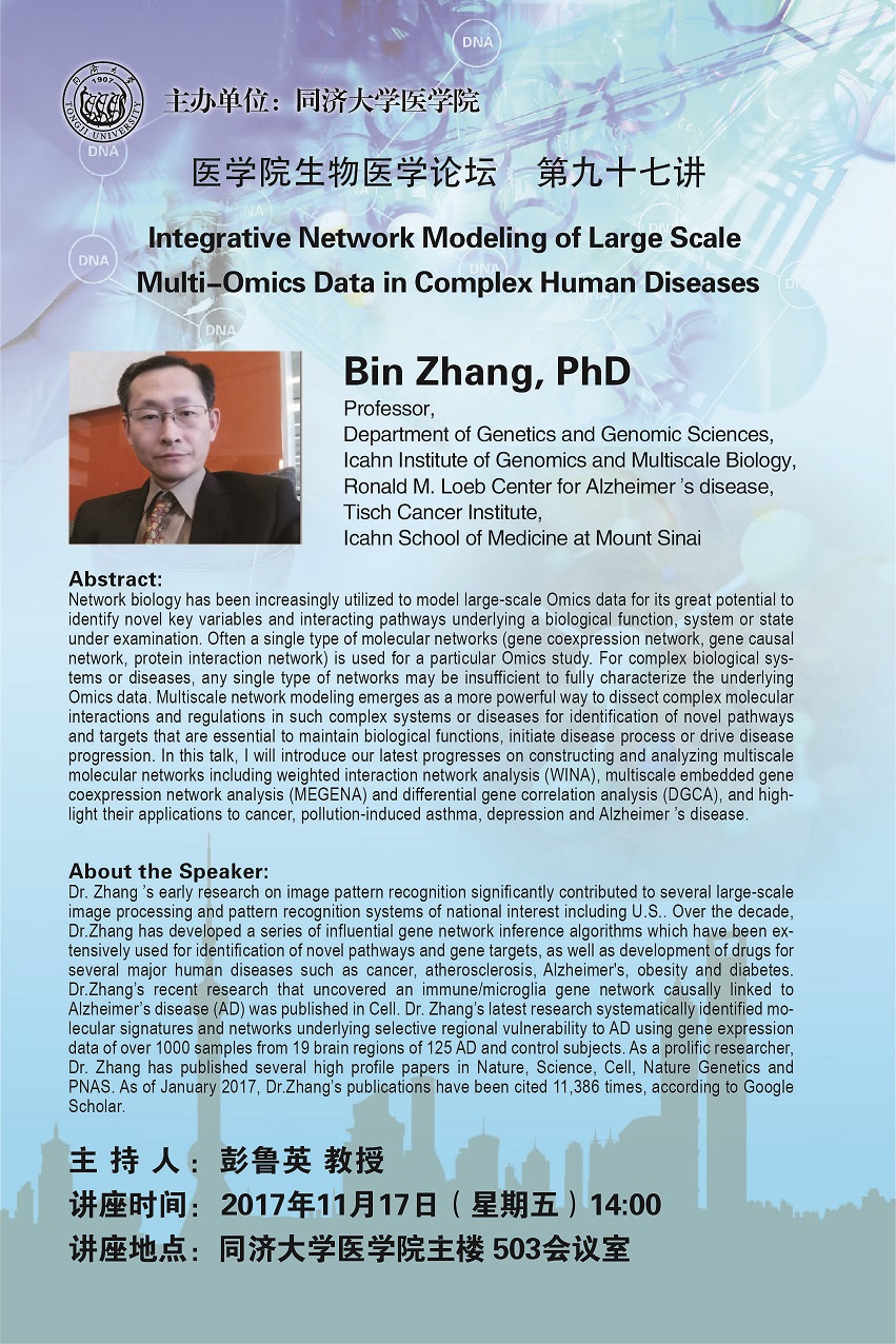 生物医学论坛第97讲:Integrative Network Modeling of Large Scale Multi-Omics Data in Complex Human Diseases