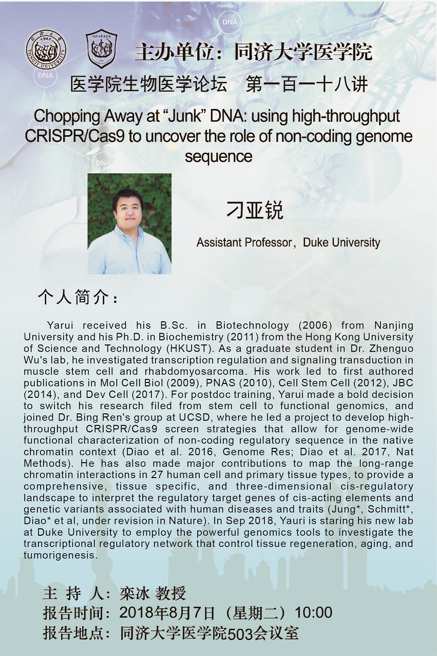 生物医学论坛第118讲:Chopping Away at "Junk" DNA: using high-throughput CRISPR/Cas9 to uncover the role of non-coding genome sequence