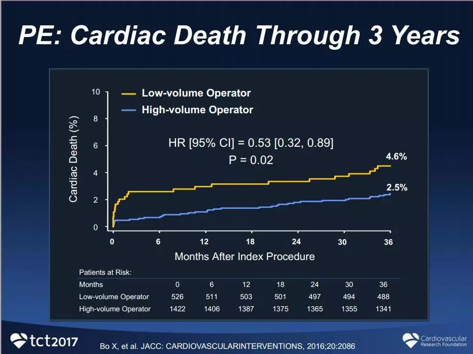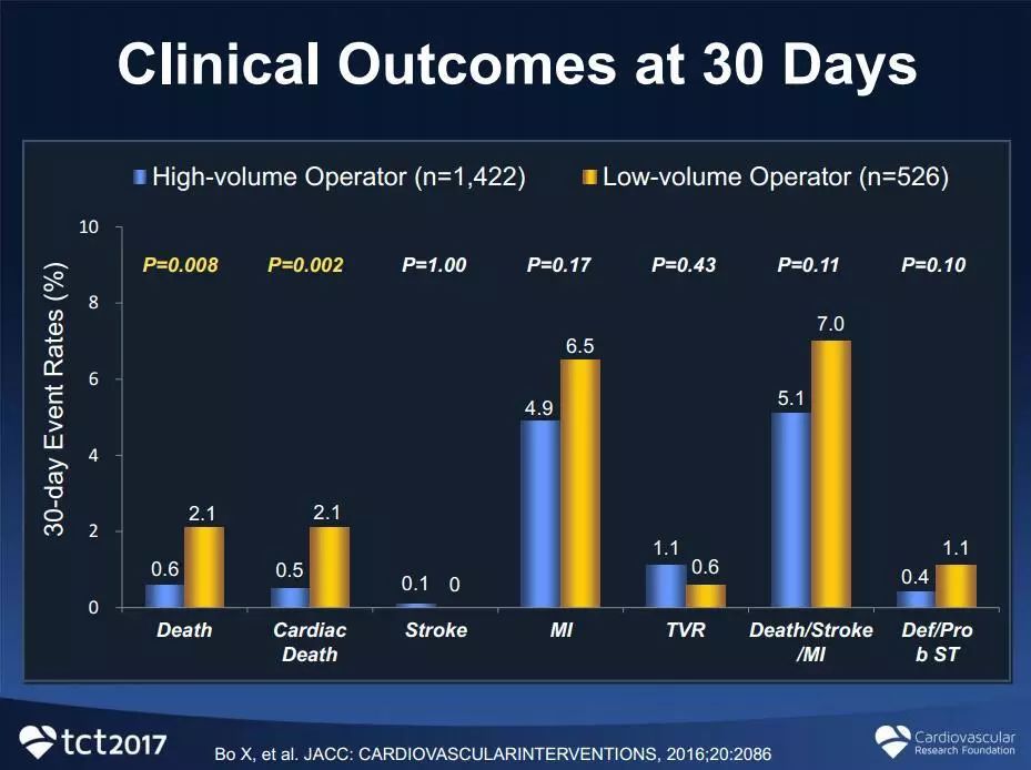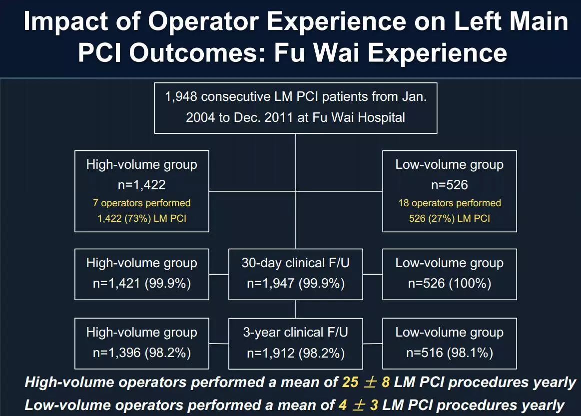 对于高危复杂病变的介入治疗,术者经验和策略制定是决定手术成败和效果的重要因素。中国医学科学院阜外医院徐波教授于2016年发表的左主干术者经验与患者临床预后关系的文章为这一话题提供了很好的循证证据。其回顾性分析了2004~2011年1948例左主干接受介入治疗患者资料,按术者分为有经验术者(连续3年每年完成左主干介入治疗15例及以上)操作组和一般术者操作组。结果发现有经验术者组患者30天、3年的死亡率显著低于一般术者组,多因素分析提示,术者经验是决定患者预后的独立预测因素之一。