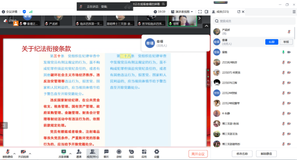 副院长杨文卓的党课主题为《强化纪律意识推进高质量医学本科人才培养》。杨文卓从《中国共产党纪律处分条例》学习的重要性、《中国共产党纪律处分条例》相关重点内容学习、《中国共产党纪律处分条例》融入医学本科人才培养工作实践三个方面进行分享。共计有110余名师生党员参与本次党课学习。