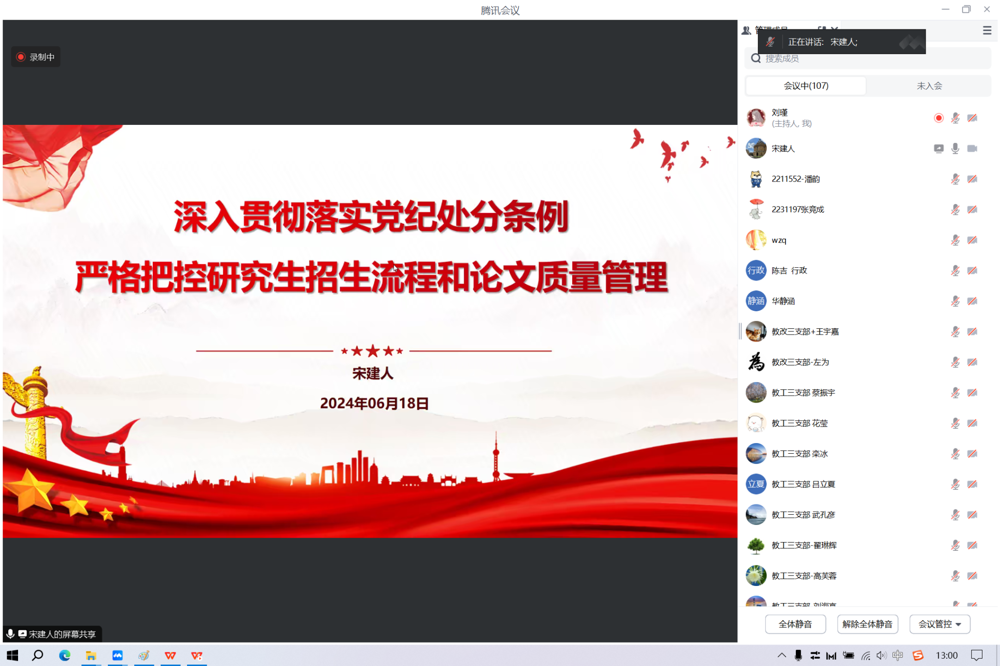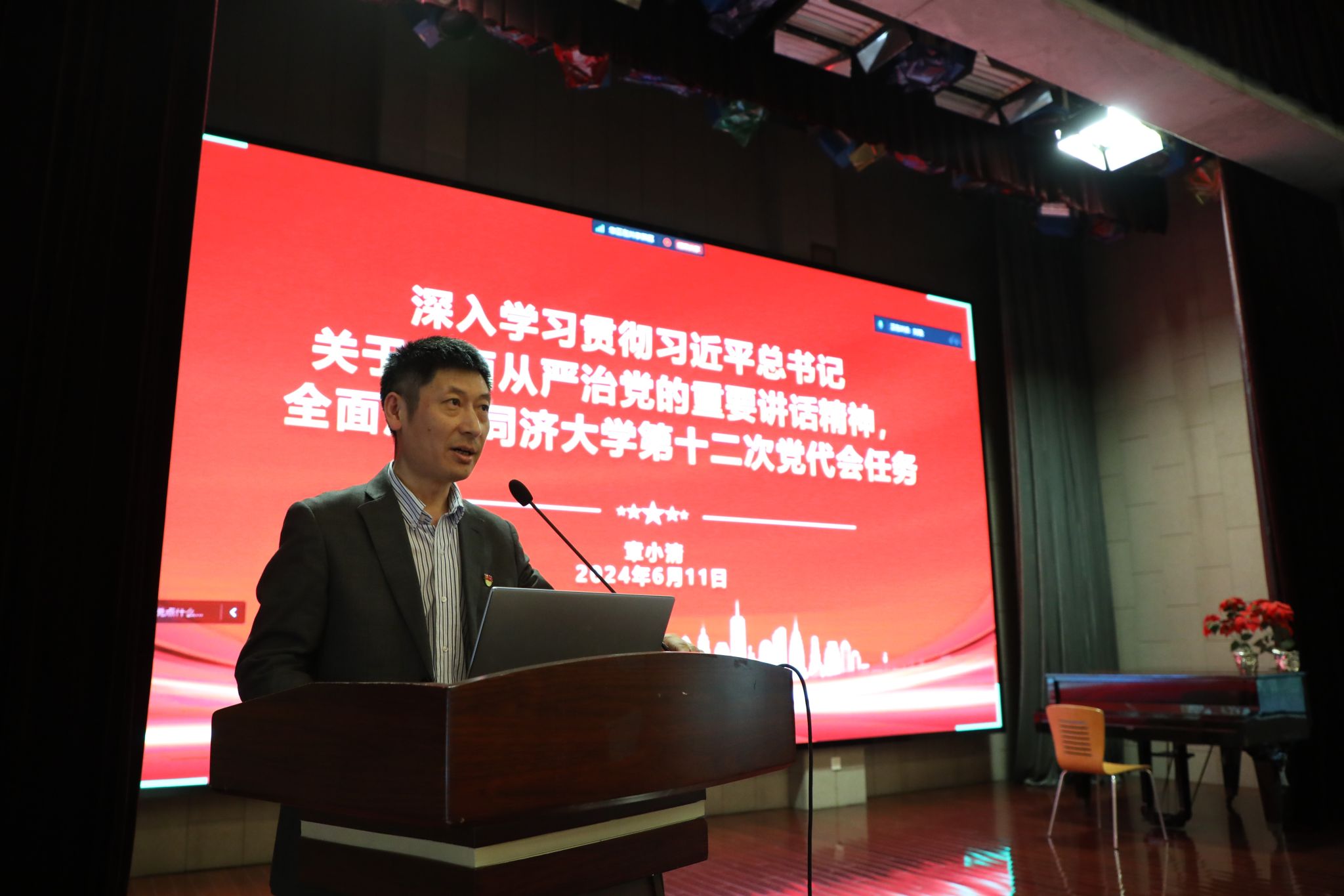 副院长宋建人的党课主题为《深入贯彻落实党纪处分条例,严格把控研究生招生流程和论文质量管理》。宋建人从学条例,守党纪,始终坚持严的基调,全面加强纪律建设、研究生招生流程和论文质量管理两个方面进行分享。共计有130余名师生党员参与本次党课学习。