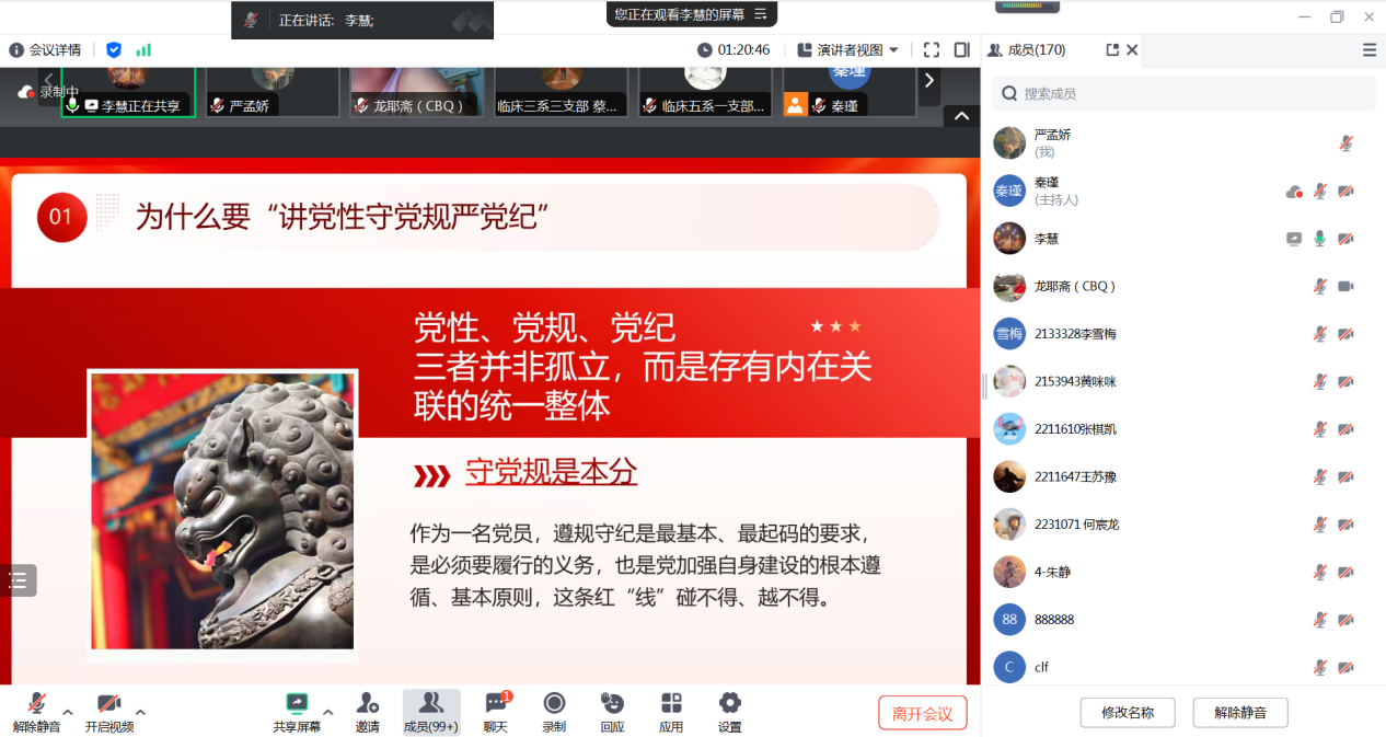 党委副书记李慧的党课主题为《做讲党性、守党规、严党纪的时代新人》。李慧分别从为什么要讲党性守党规严党纪、讲党性守党规严党纪上存在的突出问题以及讲党性守党规严党纪该怎么做三个方面进行分享。共计有170名师生党员参与本次党课学习。