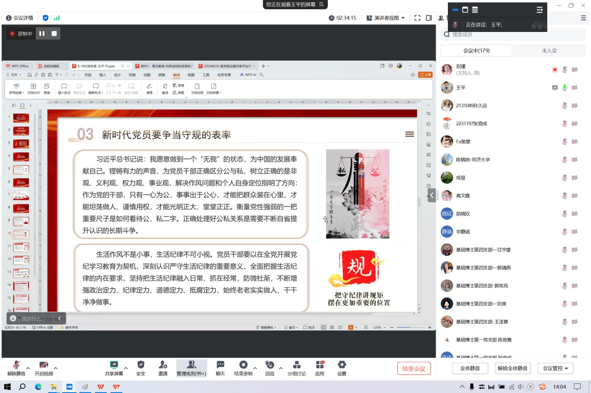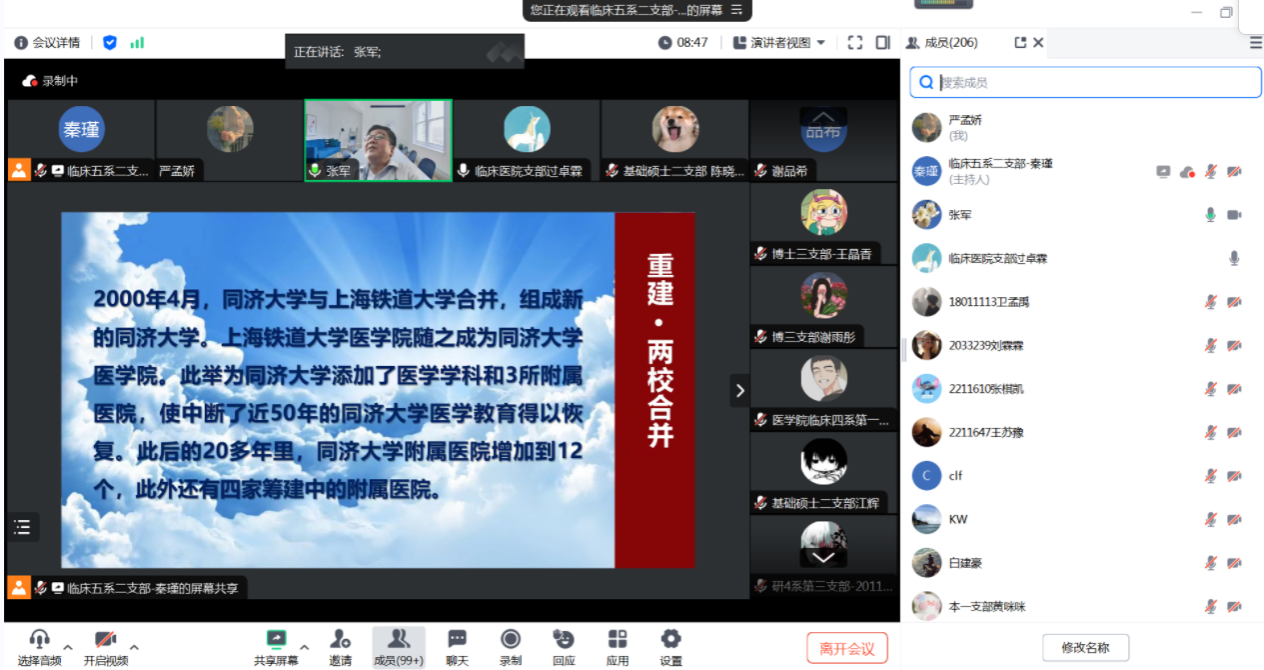 医管处处长张军的党课主题为《学党纪,促进pg游戏电子模拟器附属医院学科发展》。张军从《条例》五次修订情况、2023年修订的五个亮点、高校违纪警示案例、医疗领域反腐及学科发展四个方面进行了分享。共计有200余名师生党员参与本次党课学习。