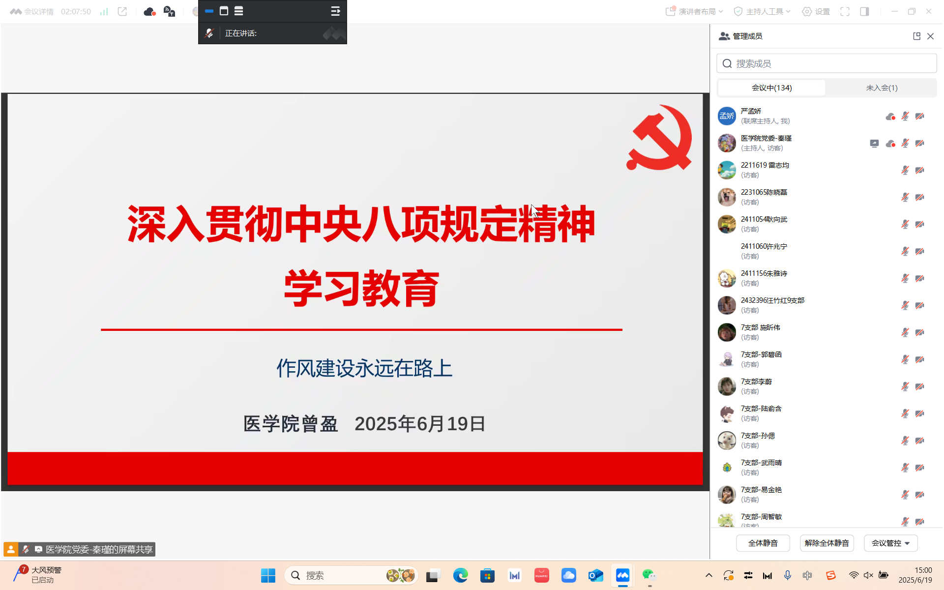 党委书记章小清的党课主题为《深入学习贯彻中央八项规定精神》。章小清分别从重温中央八项规定内容筑牢思想根基;读懂中央八项规定精神精准查找问题;违反中央八项规定精神的具体表现;狠抓整改落实以构建长效机制四个方面进行分享。