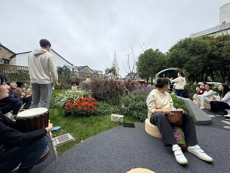 最后,在5名音乐治疗师的带领下,参与者们进行了打击乐合奏,感受音乐疗愈。大家用铃鼓和非洲鼓等乐器,跟随音乐节奏,感受合作的力量与音乐的疗愈效果。参与者们在欢声笑语中享受音乐带来的愉悦和心灵的震撼。