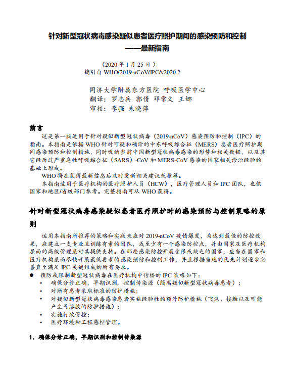 李强主任介绍说:本指南是WHO在2020年1月25日发布的最新一版针对新型冠状病毒感染疑似患者医疗照护期间感染预防和控制的指南。它主要针对各医疗机构,在对新型冠状病毒感染疑似患者实施医疗照护过程中感染预防和控制的相关部位和重点环节做了明确的要求和规定。指南系统地介绍了在医疗机构中,针对疑似新型冠状病毒感染患者实施医疗照护过程中,如何有效地实施感染的预防和控制,并就患者的分诊、早期识别和传染源的控制;针队所有患者的标准防控措施的实施;接触和空气飞沫的防控以及空气气溶胶的防控;行政管控的实施;环境和工程管控的应用;疑似新型冠状病毒感染患者实验室检查样本的收集和处理;门诊诊疗活动的相关推荐等均做了详细的规定和要求。相信随着本指南的发布以及中文版的翻译出炉,一定会对我们目前正在开展的“新型冠状病毒感染肺炎”疫情阻击战,起到积极地指导和借鉴作用。