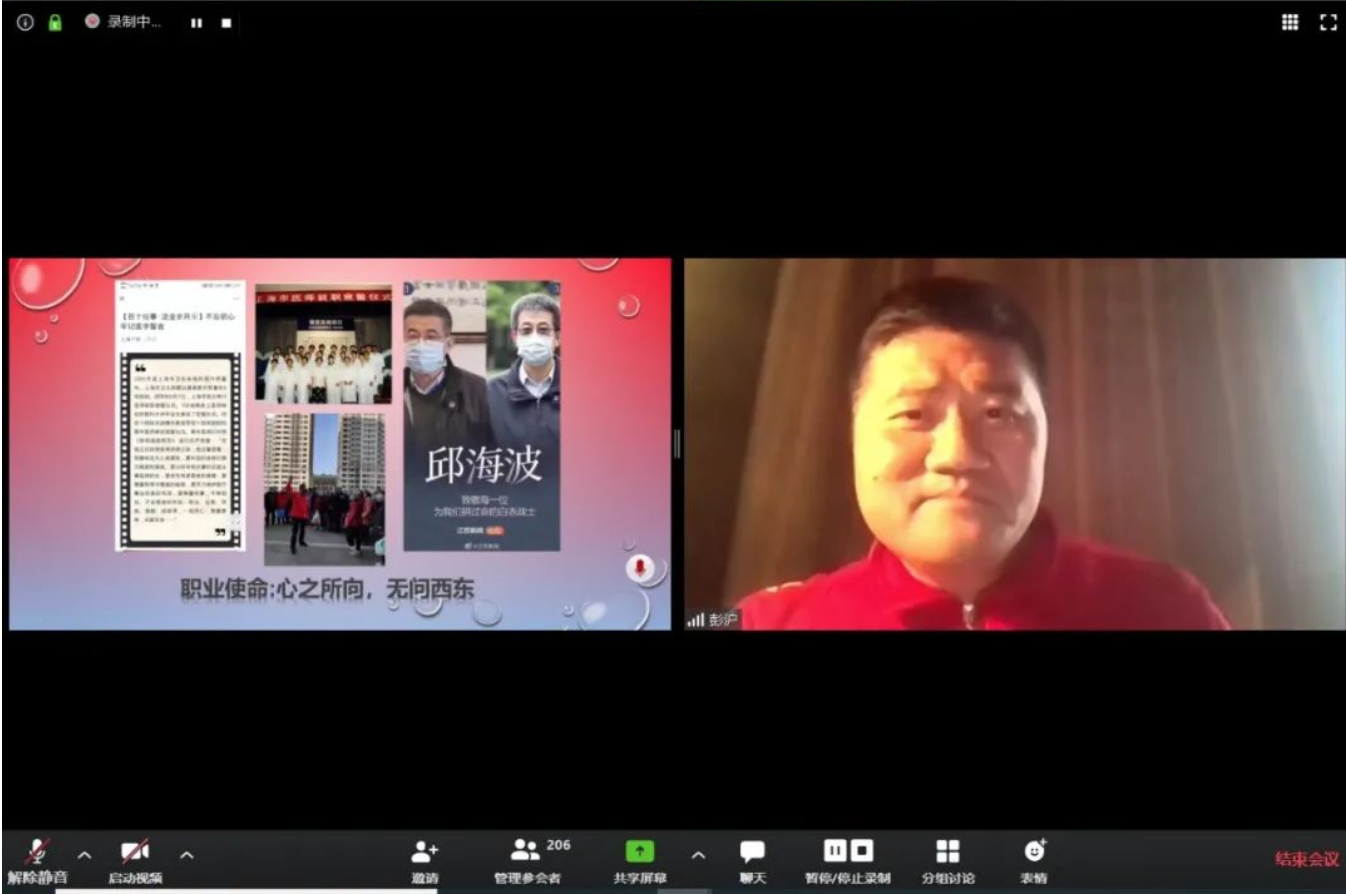4月3日下午,pg游戏电子模拟器学生党支部组织开展的援鄂先进事迹报告会在ZOOM平台云召开。pg游戏电子模拟器附属第十人民医院副主任医师,急诊医学科副主任,急诊感染党支部书记彭沪担任主讲人,以“心之所向,无问西东,但有所命,无有不从”为主题,将其亲历的援鄂抗疫工作对参会师生进行了分享。此次报告会由pg游戏电子模拟器党委副书记曾盈主持,pg游戏电子模拟器的学生党员们参与了此次报告会。