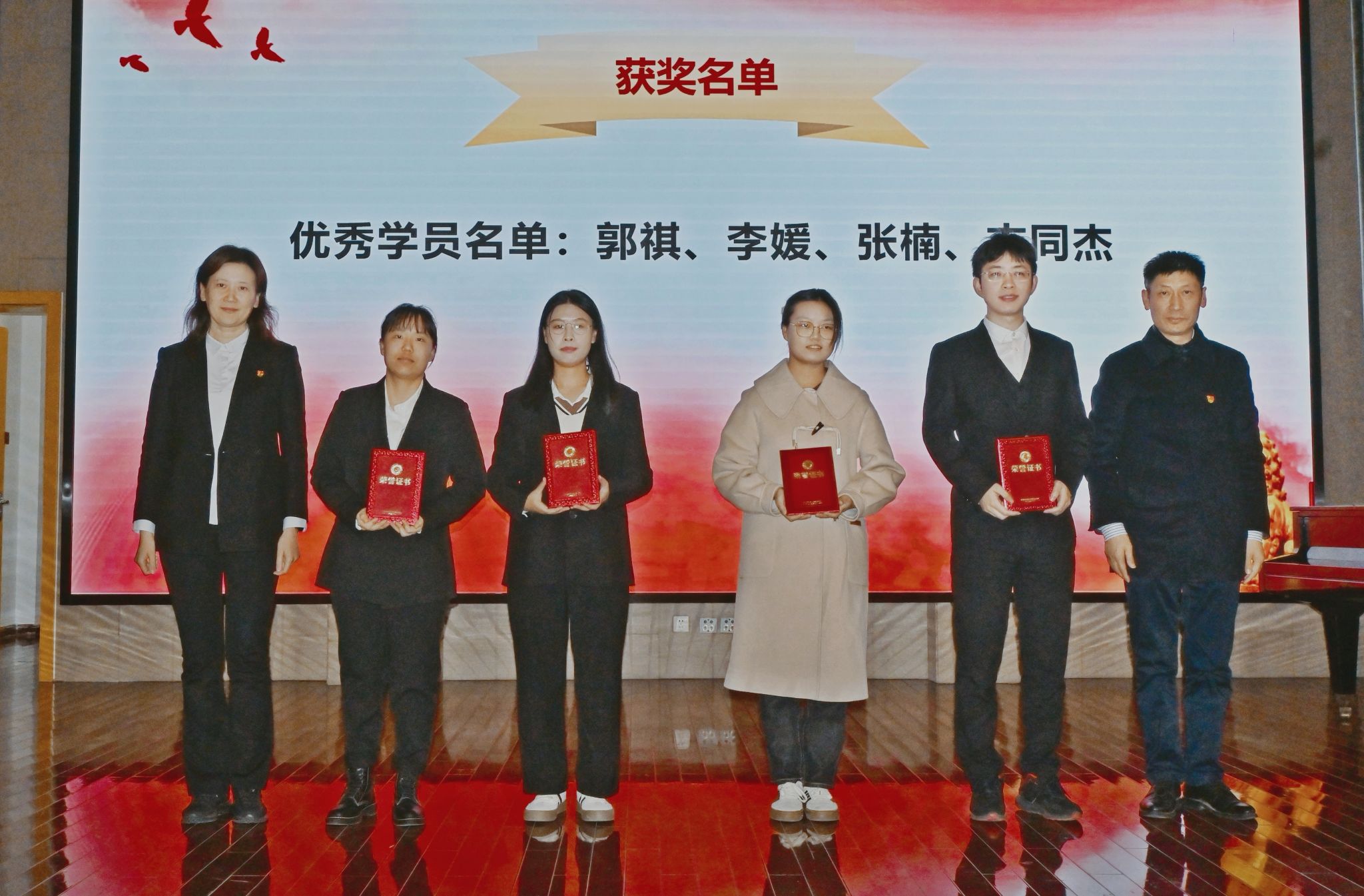 本期秋季党校共有27名积极分子和32名发展对象顺利结业,郭祺、李媛、张楠、吉同杰四位学员荣获优秀学员,由章小清书记和李慧书记上台为优秀学员颁发奖状并合影留念。